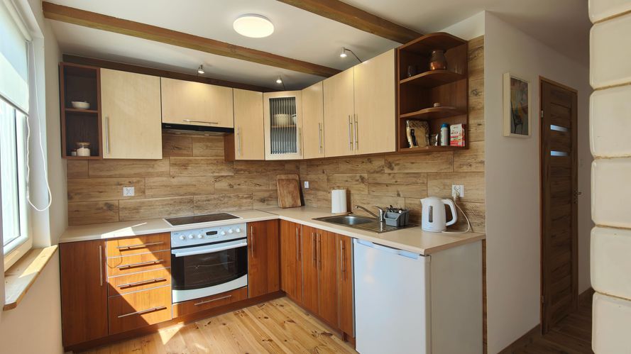 - kuchnia z pełną zabudową i AGD (płyta elektryczna, piekarnik, okap, lodówka;